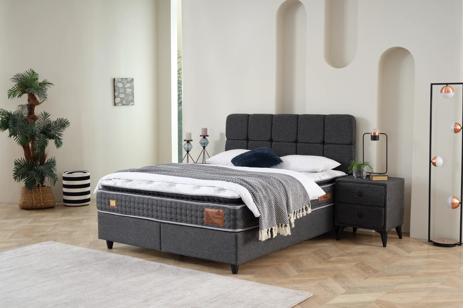 Mit dem Bologna Baza+Başlık+Yatak Seti schaffen Sie sich ein stilvolles Schlafzimmer, das Komfort und Eleganz vereint. Das 90x190 cm große Einzelbett-Set überzeugt mit einem Taschenfederkern und einem atmungsaktiven Strickstoffbezug für erholsame Nächte. Das wendbare Design fügt sich flexibel in jeden Grundriss ein.