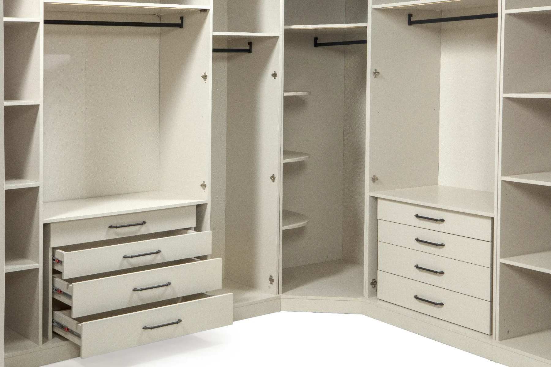 Der Venus Kleiderschrank in Vollmond-Creme verwandelt Ihr Schlafzimmer in eine ruhige Wohlfühloase mit elegantem Stil. Dank 12 Drehtüren und 4 geräumigen Schubladen vereint er großzügige Stauraummöglichkeiten mit einem zeitlosen Design. Die Eckform nutzt Ihren Wohnraum optimal und schafft eine harmonische Atmosphäre.