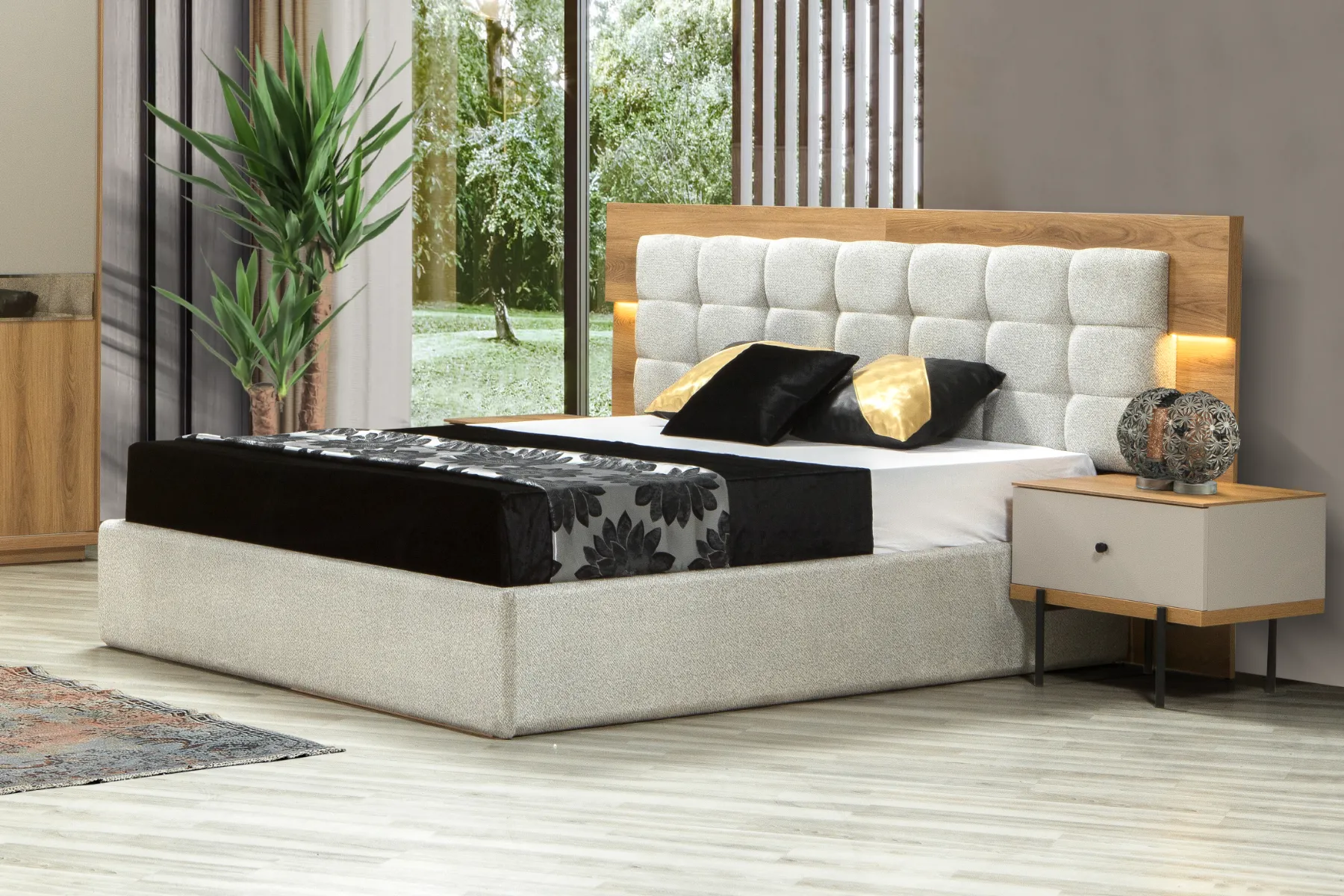 Belen Karyola, krem kumaş başlığı ve sıcak ahşap tonlarıyla yatak odanıza hem şıklık hem huzur katıyor. Entegre aydınlatması sayesinde geceleri ambiyansı yumuşatırken, geniş baza bölümü düzenli bir yaşam alanı sunuyor. 160x200 cm ölçüsüyle çiftler için ideal olan bu yatak, modern ve işlevsel tasarımı bir arada sunuyor.